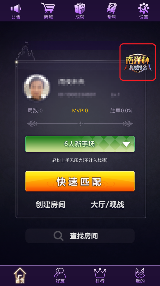 2、注册登录后在首页个人信息右上角点击“南洋杯我要报名”图标;