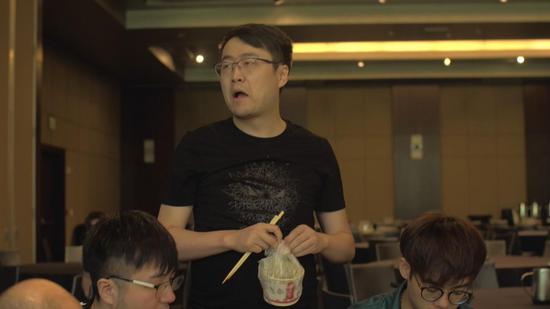 选手们忙着吃饭,吃完饭就把心思放回到比赛上去了,不过解说和主持人就不用那么高度紧张,看看斯拉克在玩的是什么?