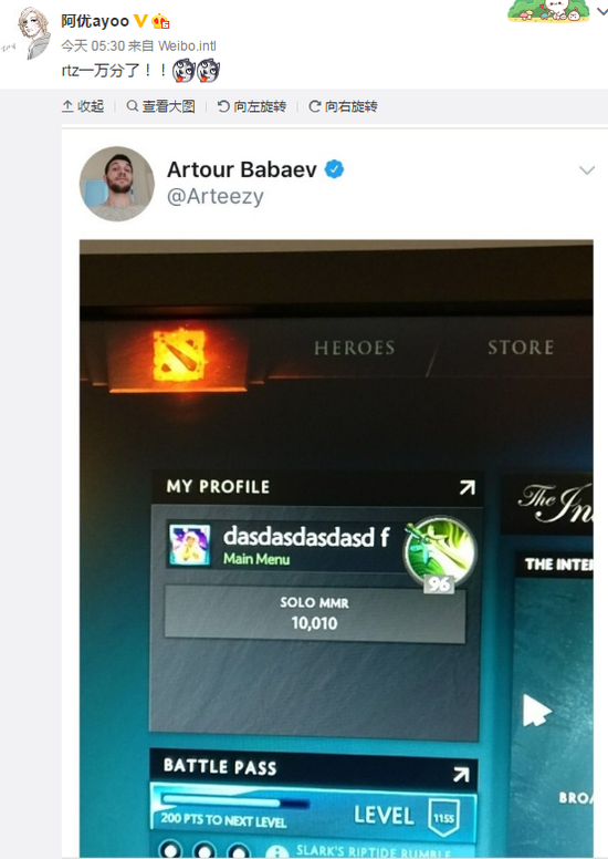 刚刚结束了TI7紧张的小组赛,看来Arteezy也没有闲着,在休赛日的第一天他就成功渡劫,成为了又一名天梯成功突破10000分的选手。