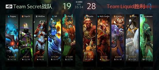 Secret在此局拿出一套卓尔游侠体系,前期双辅助连续照顾Liquid.Miracle-,Liquid的熊战士虽然经济良好却没有输出环境,Secret三路开花推进无可阻挡,Liquid在被破路追出一波也未能赢下后打出了GG,Secret先下一城。