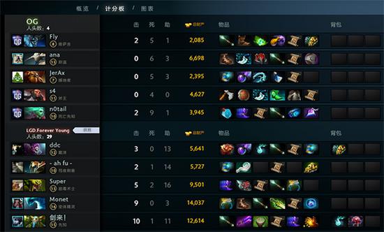 开局阿福小强再次立功,中路帮助包子剧毒拿到大爹DP一血,LFY对线期发挥出色,3路对线都打出很大优势,老板先知单杀ana斯文一次,10分钟,LFY组织进攻OG中路一塔,阿福只有4级的小强树林中杀出先手到大爹的DP开启团战,老板先知飞入后排留住OG所有人,依靠剧毒强大的粘人和输出能力,LFY10分钟0换5团灭OG奠定巨大优势!经济领先8K!人头13比3领先。生气的OG在LFY撤退之际强行追杀包子剧毒,LFY老板先知完美切入再次击杀冒进的OG三人!14分钟LFY控下一代肉山,经济领先达到1万4,比赛进入垃圾时间,18分钟LFY经济领先2万没有给OG任何喘息时间直接破掉中路高地,勉强挣扎到20分钟的OG在又一波团灭后打出GG,人头定格在29比4!本场比赛LFY再次展现出他们超快的前期节奏,优势期的压制力十足。
