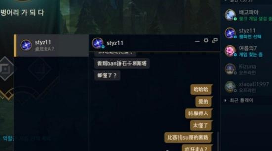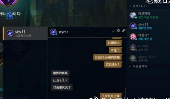 其实这些国人在打韩服,对走a怪的打法,互相都有交流的。styz11为司马老贼的ID。截图视角为Mouse的直播间……