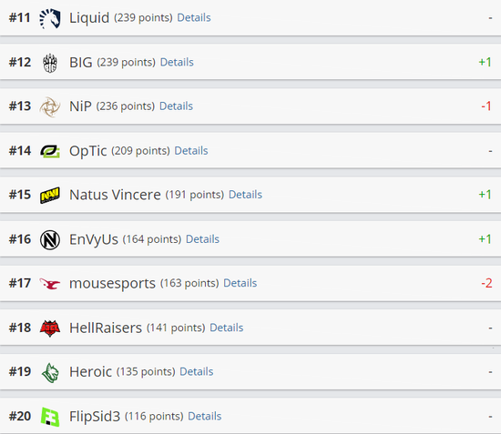 由于进入了休赛期,因此强队排名变化并不大。尽管在PGL 克拉科夫Major中无缘四强,但SK Gaming依旧位列第一,而Astralis则排名第二,新晋Major冠军Gambit是第三名。第四名战队是FaZe,由于Major的失利,他们踢掉了发挥不稳定的allu,而招入了顶尖狙击手GuardiaN。