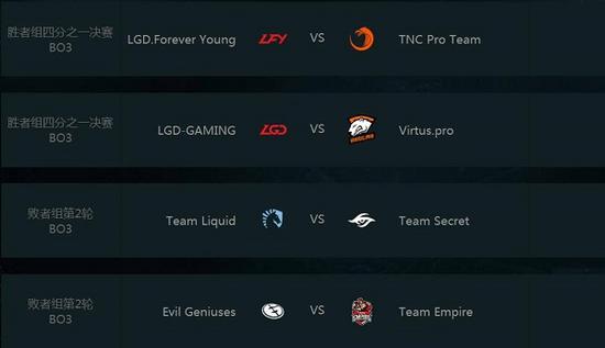 北京时间8月8日,2017年国际邀请赛结束了正赛阶段首日的比赛。在今天的比赛中,iG、Newbee分别战胜强敌挺进下一轮,而iG.V则不敌DC遗憾被淘汰。今日赛况图如下: