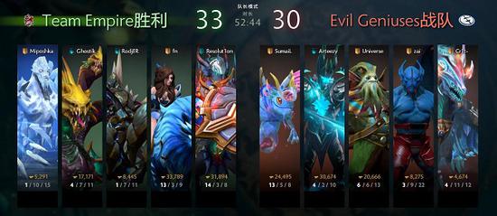 EG选择了一套强于游走的阵容,也在游戏前期取得了效果。但是Empire随即加强了视野的控制,EG的游走变得徒劳无功。而Empire的阵容在闪烁匕首到手后,先手能力极其出色,频频主动出击,灰烬之灵和斯温的双核也让EG的幻影长矛手全无发挥余地。最终,EG无力抵抗Empire的攻势,Empire先下一城。