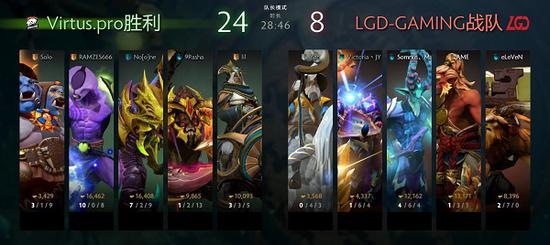 LGD遭遇的是另一支强队VP,他们也是全力以赴LGD选择了一套针对性很强的阵容,试图打出线上优势,但是被VP抓住一级的一波强势击杀LGD的劣势路英雄,一举获得优势。之后,进入夜间,VP的暗夜魔王也带动了全队的节奏,LGD全面劣势。LGD试图在团战中扭转局势,然而双方的经济差距让LGD在团战中也无法取胜,输出不足的他们在连续被团灭破路后,也只能无奈打出GG。