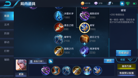 出装推荐:暗影战斧+破甲弓+破军+制裁之刃+贤者的庇护+急速战靴(可以按战情选择)