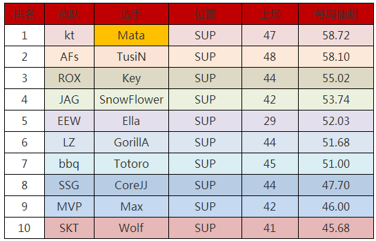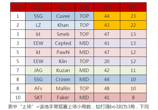 第二名到第五名被KT四名选手包揽,足以见得KT战队选手整体在夏季赛的表现是十分稳定的,对团队贡献也都比较平均。