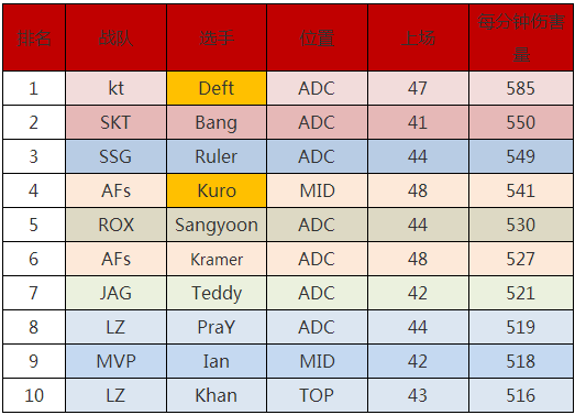 夏季赛打出爆炸伤害的选手是Deft,从LPL回归LCK后,数据最直观的告诉我们——Deft依然保持着巅峰的状态与手速。SKT的Bang与三星的Ruler分列二三名。
