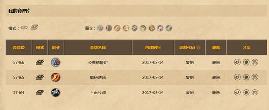 在新版本的卡牌工具中,登录后的玩家可以保存并随时查看自己的套牌数据,保存的卡组信息不仅能复制代码在游戏内导入,还能通过链接以及我们提供的三种方式(微信、微博、贴吧)分享给其他玩家朋友。