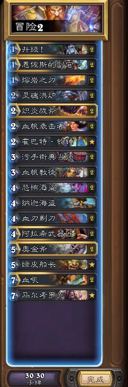 冒险模式第一区第二关的首领是死亡使者萨鲁法尔,他的英雄技能是被动技能,只会收到来自武器的伤害,这也就意味着你需要用武器职业来击杀死亡使者萨鲁法尔。对于新手玩家来讲物美价廉的海盗战相信每一名玩家都有,现在你只需要在海盗战卡组中加入一些武器就可以轻松的“砍掉”这个BOSS啦!卡组如下: