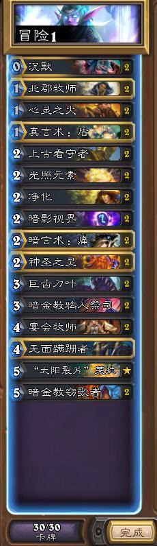 亡语者女士是第一区最后一个BOSS,其英雄技能为对敌方随从造成伤害,直到其生命值剩为1点。在本关中亡语者女士共有30点生命值和90点护甲,而无法场上有一个30-5的受伤随从踏梦者,该随从在受伤状态下无法攻击,因此我们就需要通过治疗让其回复到5血,进而就可以利用30点的高攻击在4回合内轻松击杀亡语者女士。在本关中最简单有效的卡组就是治疗牧师了,卡组具体内容如下