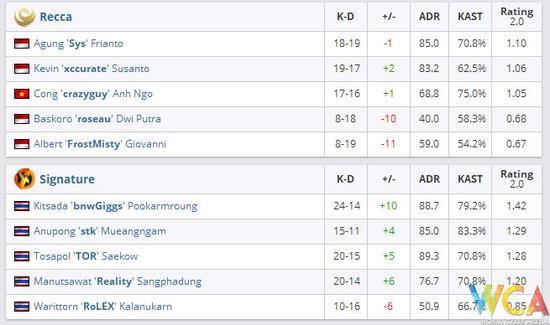 进攻方的Recca 5名队员Rush B,在下完包的情况下被Signature回防成功,拿下手枪局的Signature战队乘胜追击打了Recca一个措手不及,把比分打成了6:0;在第7局开局Signature有名失误被盗走Recca的队员抓住机会扳回了一分,然而Recca在随后进攻无果只拿到了3分,比分为12:3;下半场开局Recca回防成功拿下手枪局,随后靠着枪械优势连拿2分,把比分追回12:5,Signature的队员在第三盘强起成功,开始了疯狂的进攻,Recca虽然防守成功了几回合,却因为上半场失分严重,被Signature以16:8的比分结束这场比赛。