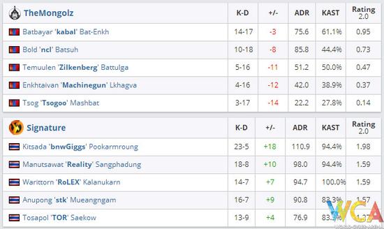 CT开局的Signature成功拿下了手枪局,然而不知道为什么,丢掉手枪局的Mongolz一蹶不振,被Signature上半场剃了个光头,上半场;下半场Signature选择了一波Rush B,被Mongolz回防成功拿下手枪局,之后第二局ECO的Signature选择Rush B,被MongolzB区的队员刷屏结束,因为Signature上一局没有购买物品,第三局的他们选择强起AK,Signature的队员们并没有给Mongolz过多的机会16:2拿下了本场比赛的胜利。