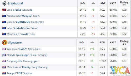 CT开局的Signature成功拿下手枪局,随后连拿4分,Grayhound在多次进攻无果之后找到了防守弱点拿下一分,之后双方互相得分,上半场比分为8:7;下半场Signature一波RUSH B拿下手枪局,在Signature疯狂的进攻下,Grayhound的防守仅仅只拿了2分;Signature以16:9的比分拿下比赛的胜利。
