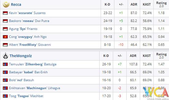 上半场拿下手枪局的Recca一波小高潮拿到5分,但是Mongolz顶住了压力开始追分,上半场比分为7:8,下半场Recca进攻B拿下手枪局,接着趁着自己枪械优势拿下了经济局,然而长枪局的Mongolz的队员们顶住了进攻的压力,以16:13的比分拿下了本场的胜利。