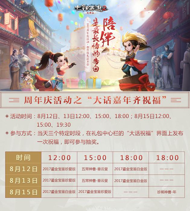 大话嘉年,祝福夺奖!8月12日、13日12:00、15:00、18:00及8月15日12:00、15:00、19:30,诸位玩家们可在礼包中心栏的“大话祝福”界面上发布对大话的祝福,每次发布祝福后可获得1次抽奖机会,有机会获得珍稀神兽-年、五常神兽-垂云叟、2017鎏金宝鉴(珍爱版、白金版)等丰厚大奖。