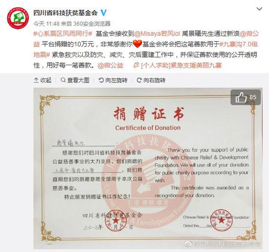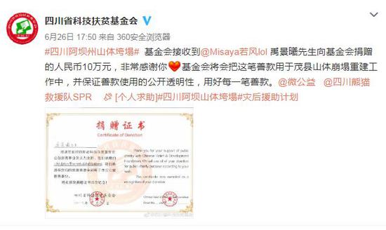 若风虽然低调行善,但是捐款后的他很快就被四川省科技扶贫基金会和微公益在微博上点名感谢。