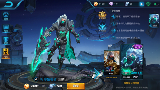 为了迎接许久没有出新皮肤的本命英雄之一兰陵王,暗隐猎狩者上架,蓝烟开启兰陵王专场。在微博中蓝烟写到: