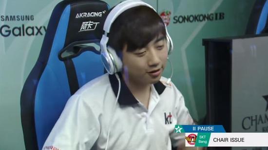在夏季赛第五周KT对阵SKT战队的第三局比赛中,当时双方已经战成1-1,正在进行决胜局的生死之战,在游戏开局2分钟后,ADC选手Bang突然申请了比赛暂停,原因是他觉得坐的这张椅子不够舒服。这个让所有选手、工作人员以及粉丝们都为之震惊的理由,也成为了史无前例的记录。不过最终还是没有更换椅子,只是换了一个椅子上承托手腕的护垫,在完成调整后,SKT战队继续作战,最终在这场比赛中取得胜利,也从连败的低潮中找回了信心。不过前面都打了两局比赛,突然才觉得椅子不舒服确实有点奇怪,一般在比赛开始之前都会有调试的机会。