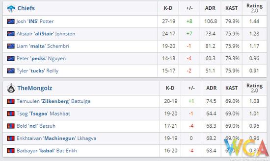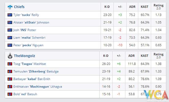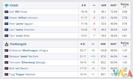 下半场开局,作为防守方的Chiefs像是和进攻方互换了位置一般,全线出击,打了Mongolz一个措手不及,零伤亡的他们直接拿下手枪局。随后他们稳扎稳打收下经济局,第四回合长枪局开始Mongolz 选择Rush B,同样打了Chiefs一个措手不及,然而因为上半场劣势太大,Mongolz 填不满自己挖的坑,被Chiefs以16:13结束了本场比赛。