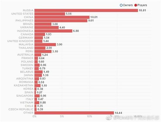 图为今年年初SteamSpy统计的DOTA2玩家国家分布图,由此图可见,中国的DOTA2 玩家数量位居第二。当然,中国DOTA2玩家数量远远少于名列榜首的俄罗斯,与排名第三的菲律宾也差距甚小,但考虑到可能数量更多的已经AFK但仍然看比赛并关注DOTA2的“老年选手”,总的来说,DOTA2在中国并不能算dead game。