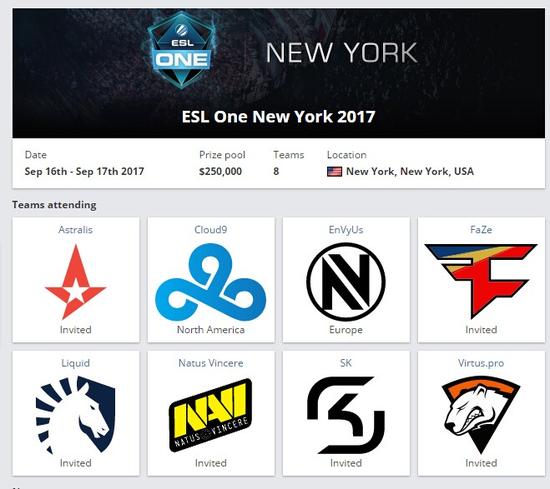 ESL One纽约站作为独播季压轴大戏,8支战队将在大都会纽约展开激烈争夺,总奖金共25万美元,SK、VP、Astralis、FaZe、C9、EnVyUs、Liquid、Na’Vi将参赛。
