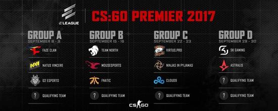 继6月份ELEAGUE Clash For Cash后,ELEAGUE再一次展现出他们的土豪气质,总奖金达100万美元的ELEAGUE Permier联赛将于9月8日-10月13日在美国亚特兰大进行,16支战队将通过小组赛和淘汰赛决出最终冠军,目前已确定12支参赛战队,他们将分成四组在不同时间前往亚特兰大进行线下比赛决出小组出线战队,具体赛程还有待更新。