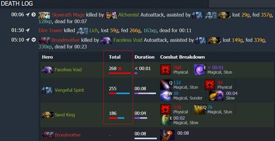 以上图为例,5分10秒,虚空、沙王、VS合力击杀了蜘蛛。在此次击杀中,三名英雄分别贡献了268、255、186点伤害。累加英雄在每一次击杀\助攻中贡献的伤害,得到新的伤害指标——「致命伤害」。(注:用官方提供的全量伤害减去致命伤害,可以得出「消耗伤害」)
