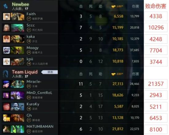 有了致命伤害这个新指标之后,我们再回头看TI7的最后一场比赛。队伍层面,获胜方Liquid比NB高出1万4千点致命伤害(毕竟赢了嘛,人头也多10个);英雄层面,2W致命伤害的剑圣和1W致命伤害的DP是两个队伍的中流砥柱,有没有更符合大家看比赛时的直观感受?