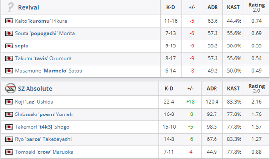 在首轮线上海选赛中,由前日本职业CS:GO俱乐部Rascal Jester核心成员组成的D组队伍SZ.Absolute备受瞩目,Rascal Jester曾在去年首届极限之地CS:GO亚洲公开赛中代表日本参加线下总决赛,因此今年SZ.Absolute能否顺利出线,成为本场赛事一大看点。最终在激烈的角逐后,SZ.Absolute不负众望,在小组决赛中以16:2击败Revival队,获得了晋级资格。