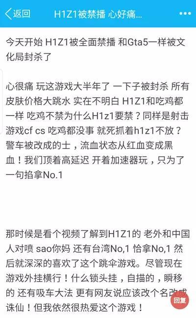 昨天封禁公告发布后,有H1Z1玩家在虎扑社区发了一则“心好痛”的帖子,内容颇具代表性。贴主对“吃鸡不禁为什么要禁H1Z1”的现象表示了疑惑,字里行间流淌出对这个游戏深深的热爱:“开着高延迟,开着加速器玩,只为了一句掐拿No.1”、“看到老外和中国人对喷和sao你妈后深深喜欢上了H1Z1”、“尽管外挂横行,游戏环境恶劣,但依然很热爱这个游戏”。