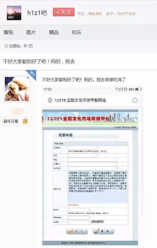 昨日下午,H1Z1贴吧的一名网友在宣言“不好大家都别好了吧!”之后,决定举报H1Z1的竞品游戏——如今Steam上发展势头最旺的《绝地求生:大逃杀》,并在帖子里附上了他在“全国文化市场举报平台”举报“大逃杀”成功的截图。