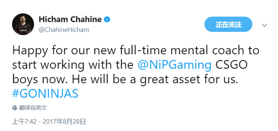 日前NiP战队宣布签下一名全职CS:GO心理教练。