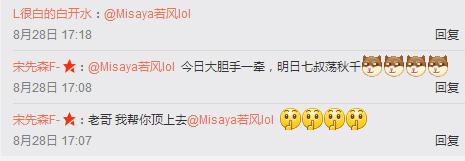 当然提到若风,我们当然会想到另一个电竞圈单身狗—Miss。在Miss七夕祝福的微博下面,网友纷纷@若风。