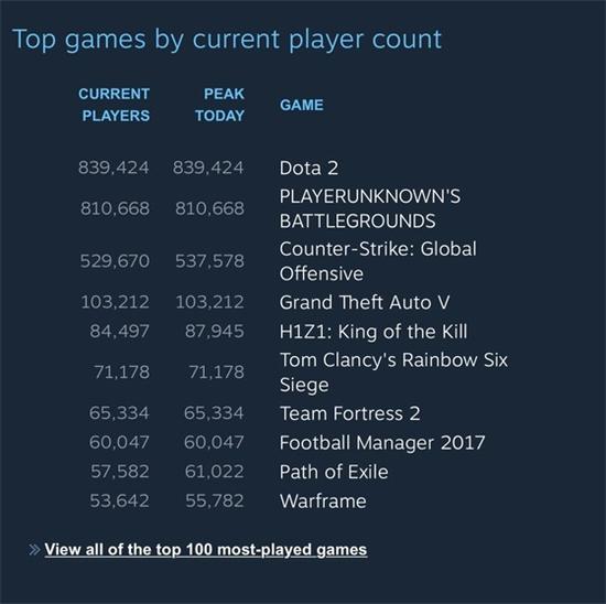 如上图,可以看到,《绝地求生:大逃杀》同时在线人数超过了81万,《DOTA2》当前大约84万人,二者之间仅差3万人。