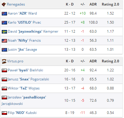 率先同时进行的两场淘汰赛分别为VP对阵Renegades以及Cloud9对阵B.O.O.T-d[S],Renegades在Cache上一扫大比分负于Astralis的颓势,先做T开局就取得了10-0的领先,反观VP则始终处于被Na‘Vi击败的阴影当中。VP艰难取得第11局胜利之后马上在第12局被对手重置了经济,无论是经济上还是气势上都遭到了彻彻底底的打击,上半场的比分也定格在14-1。