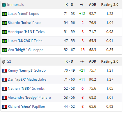 steel几乎以一己之力扭转了Inferno上的局势来到Overpass,手枪局shox在剩下不到30秒的时间先追死了银行的CT,之后在埋包过程中回头一枪秒掉了姗姗来迟的LUCAS,为G2先下一城。之后再次遭遇翻盘的G2用一波快攻RUSH为自己找回了面子,而强起效果不佳的Immortals不得不面对1:5的劣势开局。进入长枪局,巴西人的双狙帮助他们扳回两分,但随后不太明智的3人中路前顶让他们再次回到了经济局。另一边的G2虽然默认阵型总是被巴西人的非常规所干扰,但第二时间的集合强攻非常有效,一波6:1小高潮后,G2以11:4结束了上半场。