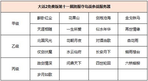 本届比赛各级别服务器名单如下——甲级:醉卧红尘、花果山、剑烛沧海、金戈铁马、天涯相随、一生所爱、似水年华、再世情缘;乙级:北国风光、花朝月夜、对酒当歌、杏花雨、仗剑伏魔、水云仙府、长安月下、烟雨楼台;丙级:故剑情深、问鼎天下、四世轮回、六桥烟柳、岁月如歌。此战事关服务器荣耀与福利,等你参战!