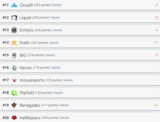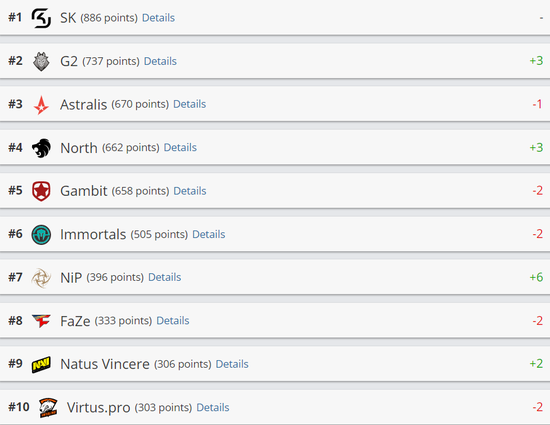 丹麦一哥Astralis的排名滑落至第三位。而NiP和Natus Vincere的排名则分别上升至第七位和第九位。