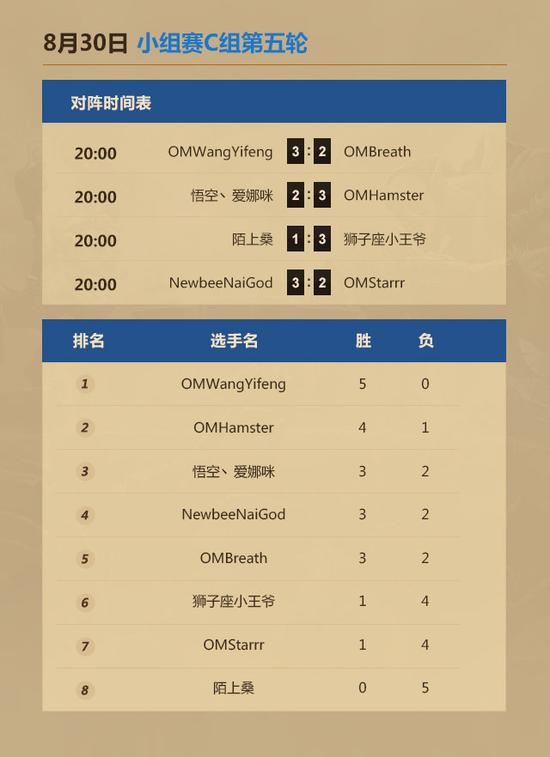 C组另外三场比赛,OMWangYifeng 3:2 击败OMBreath取得小组赛五连胜;悟空丶爱娜咪 2:3 不敌OMHamster;陌上桑 1:3 负于狮子座小王爷。