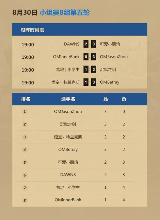 B组剩余比赛,DAWNS 2:3 负于可爱小弱鸡,OMJasonzhou 3:0 战胜OMInnerBank取得五连胜,营地丨小学生 1:3 不敌沉默之剑。