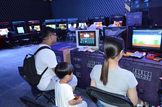 而红白机游戏就根本不用游戏币,可能是为了怀旧,选用的电视机看起来有些陈旧,开机屏幕上显示着大大的“囍”字。作为伴随一代人的游戏记忆,玩红白机的玩家年龄相对来说也较大,在现场还看到了让我忍俊不禁的一幕。