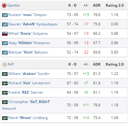 来到下半场,手枪局NIP耐心应对Gambit的A点爆弹战术,并拿到了5打3的人数优势,但没想到自己的枪法失误被mou抓住了机会,5杀过后Gambit士气大振,几次拿下关键长枪局后,比分已经被逐渐追平。下半场崩盘的NIP叫出两个暂停调整战术,并终于凭借GeT_RiGhT管房的传射双杀拿到了赛点。决胜阶段,经济积累良好的Gambit凭借Mou的狙击破点将NIP送入仅有一把出长枪的最后一局,瑞典人最终没能终结比赛。下半场同样打出一波13:2的Gambit将比赛拖入加时。