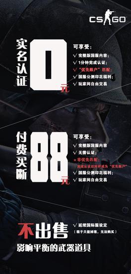 以往,国内的网游商业模式多为以下三种:一是时长制、包月制收费,二是游戏免费、属性道具收费制,三是买断收费制。而CS:GO国服双轨同服制不会产生强制付费点,也不会出售影响游戏平衡的道具,这为广大玩家带来两大利好:第一,“认证免费制”与“买断制”都不售卖任何影响平衡性的武器道具;第二,“认证免费制”与“买断制”实现真正的同服竞技,拥有同样的游戏体验。唯一的区别是考虑到实名认证作弊门槛更高,实名认证用户认证成功将直接获取优先账号资格,获得与其他优先账号玩家匹配的权利。