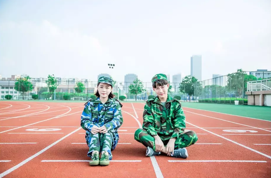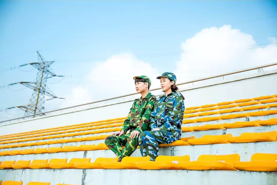 蓝天背景,端坐在学校的体育场,旁边是一位长相清纯的女生,青春无敌。