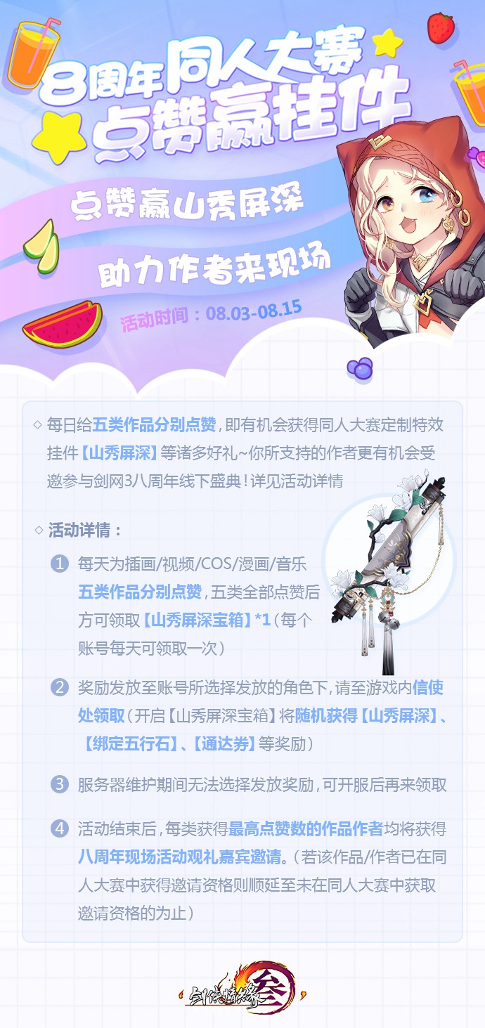 同人大赛点赞活动也将在今天12:00正式启动,侠士每天为喜爱的作品点赞就有机会获得定制特效挂件“山秀屏深”!作品人气最高的作者也将受邀亲临剑网3八周年线下盛典哦!