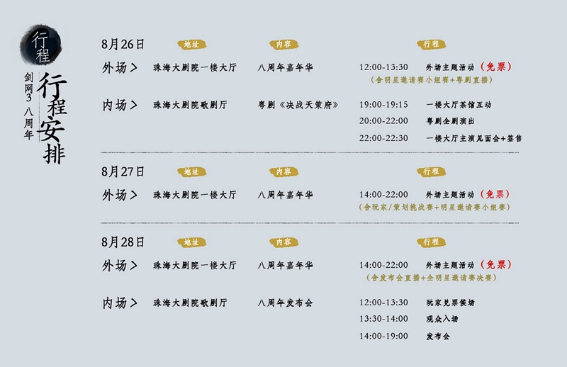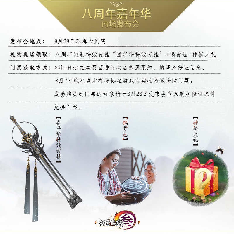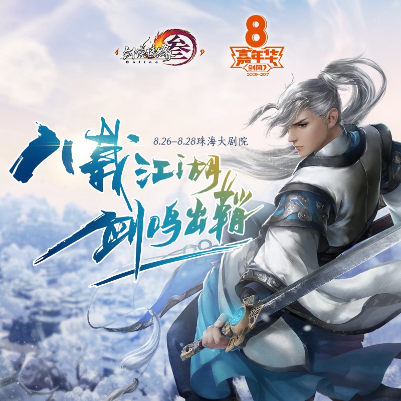 《剑网3》八周年发布会将于8月28日在珠海大剧院隆重开幕。感谢与《剑网3》一路相伴并予以诸多支持诸位侠士!期待与您一同见证《剑网3》“八载江湖,剑鸣出鞘”的震撼与感动!