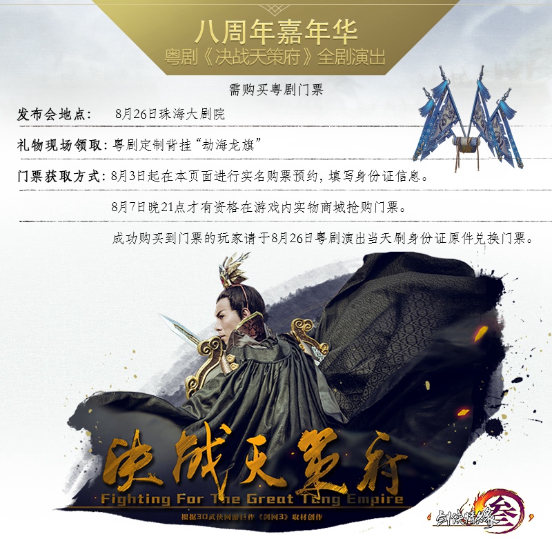 在刚刚过去的7月,《决战天策府》登陆东方卫视喝彩中华节目,以新颖的表现形式和扎实的基本功受到评委老师霍尊、王珮瑜、徐帆、程雷的一致好评。除了826的全剧演出,广东粤剧院的《剑网3》主题新剧目也将在本次嘉年华公开,敬请期待。