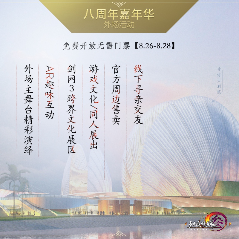 八载江湖,剑鸣出鞘!《剑网3》八周年嘉年华即将于8月26日强势启动,选址全国唯一海上歌剧院——珠海大剧院,在最专业的舞台为广大侠士奉上前所未有的视听盛宴!外场主题漫展活动、明星邀请赛和粤剧《决战天策府》全剧演出好戏连台,八周年发布会28日揭晓《剑网3》重制版、《剑网3:指尖江湖》绝密爆料,更有豪华珍藏版周边奉送!